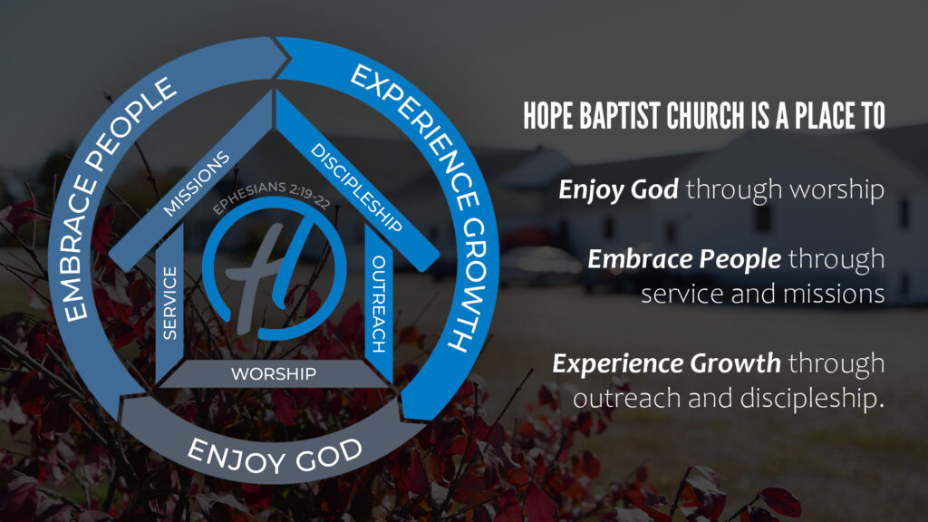 Hope Baptist Church is a place to Enjoy God through worship, Embrace People through service and missions, and Experience Growth through outreach and discipleship.