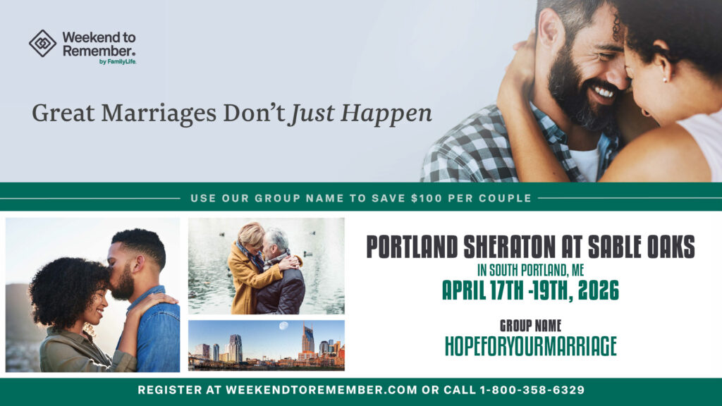 - A Weekend to Remember Couples Retreat. This retreat will take place on April 17 – April 19, 2026 at Portland Sheraton at Sable Oaks. For more information or to register click on the button below. When you register, use HopeForYourMarriage as the group name. This will give you a discount.