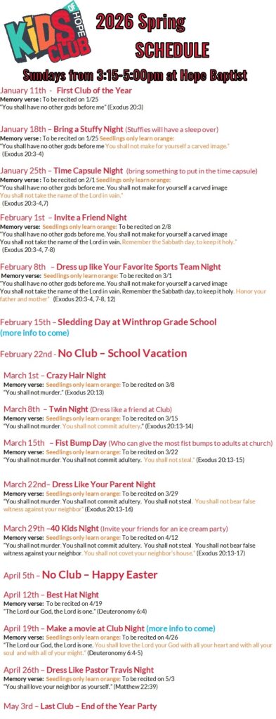 Kids of Hope Club meets each Sunday afternoon (during the school year) from 3:15pm to 5:00pm in the Fellowship Hall of Hope Baptist Church.